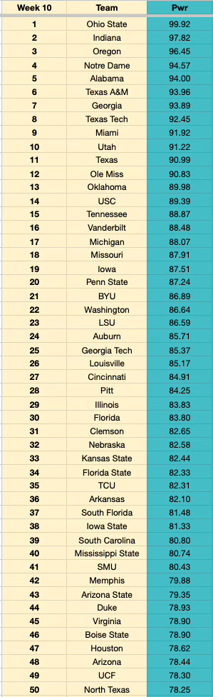 Let’s get to business. Here is the top 50 in my power ratings heading into Week 10: