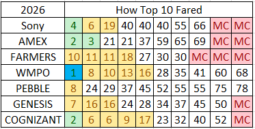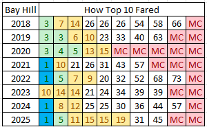 4/6 (67%) with at least 2 Top 10 finishes in their last 4 starts