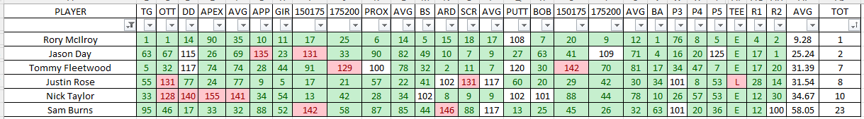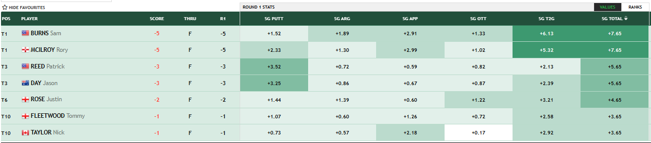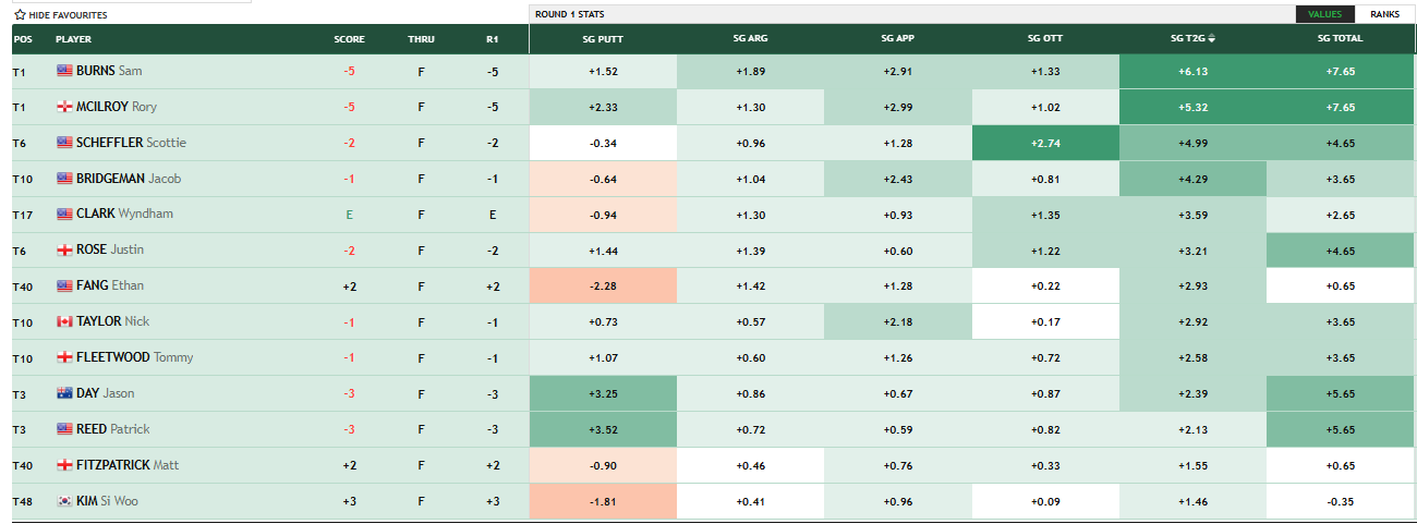 Curious to see how many players can consistently gain across the bag as the week progresses. The leaders by the end of tomorrow will draw the tougher afternoon conditions over the weekend, so sustaining those strokes gained numbers in a more difficult setup will be key to identifying who’s still in the mix come Sunday. Sam Burns at the top and Nick Taylor are both surprises given their form this season. Let’s see if they can back it up tomorrow—I’ll likely be fading at least one of them in Round 2.