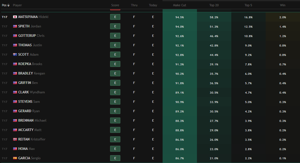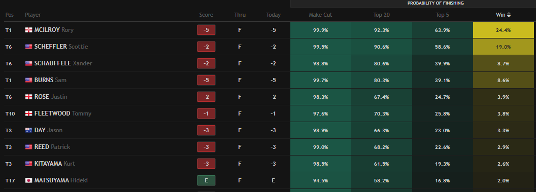 Overall, the course and weather delivered exactly what you want—everything from eagles and birdies to gritty pars, with plenty of bogeys, doubles, and even a few blow-up holes mixed in. It’s the kind of setup that really separates the field. After watching the Rory McIlroy Amazon Documentary last night, I was curious how Rory McIlroy would come out, and he answered that right away. A stress-free clinic and just his third sub-70 opening round in 18 attempts—that’s been the weak spot, and why I stayed off the outright at shorter numbers. With the course expected to firm up and play tougher each day, that sets up perfectly for him. And honestly, what better full-circle moment Tiger Woods moment than someone going back-to-back for the first time since he did it? I was surprised to see slow starts from Bryson DeChambeau and Jon Rahm, but with conditions getting more demanding, I expect at least one—if not both—to bounce back and make a push to the weekend. Looking at the board, it’s hard to argue with DataGolf having over 50% of the win equity tied up in Rory, Scottie Scheffler, and Xander Schauffele. That feels about right and no breaking news there. I liked the start from Patrick Reed and I’m interested to see how he comes out tomorrow. Also keeping an eye on Hideki Matsuyama—if the approach game shows up like it has in his last couple starts (and really most of 2026), he can climb quickly.