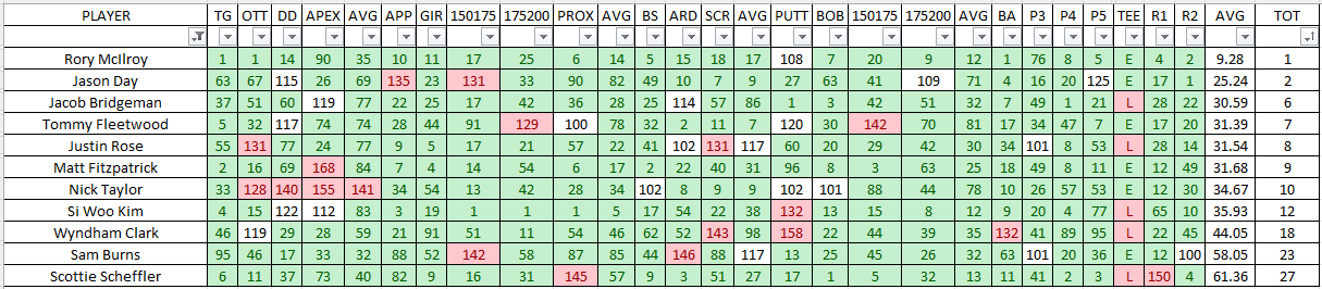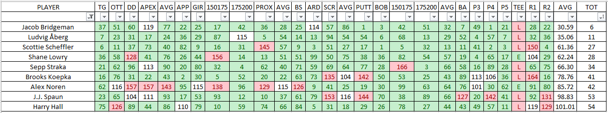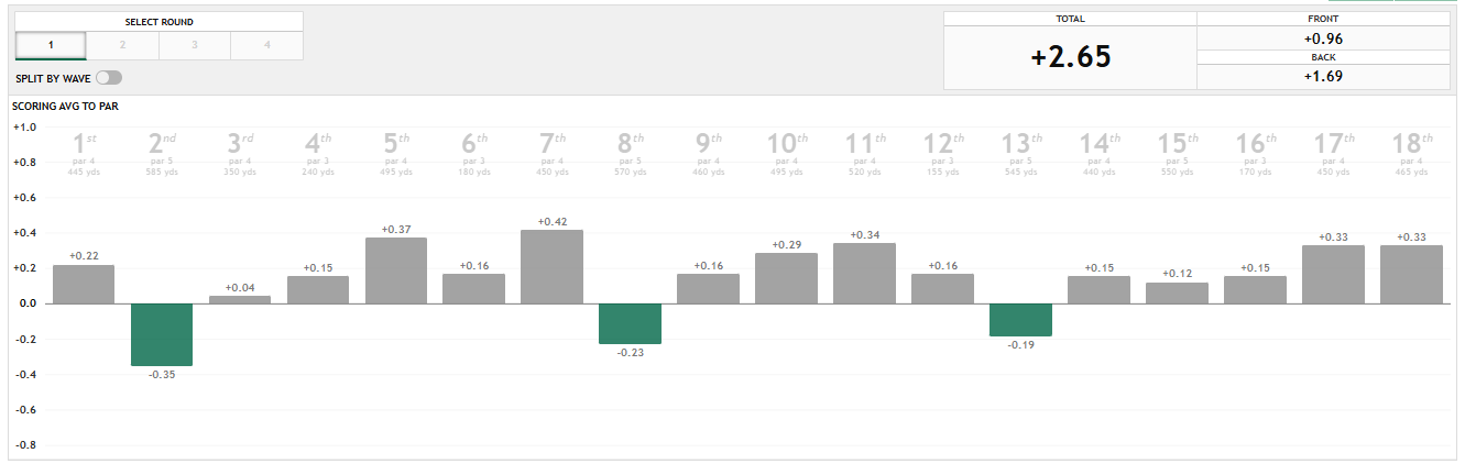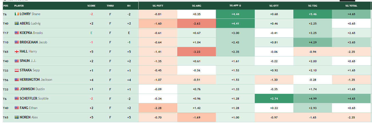 Ludvig Åberg got off to a great start with a steady par-birdie rhythm, but a poor drive on 8 really flipped the round and led to a disastrous closing stretch. He’s the kind of elite player who can burn bettors on a day like today, but I fully expect a bounce back in Round 2. Brooks Koepka is an interesting case—Top 10 Tee-to-Green and Top 5 in Approach after Day 1. That said, the same issues we’ve seen all season showed up again, with the driver and putter holding him back. Scottie Scheffler looked elite early, then settled into neutral—very similar to what we’ve seen from him throughout 2026—coasting home to a 70. The question is whether that was conditions-driven or just more of the same trend we’ve seen over the past few months. Lastly, he may be a debutant, but I really like what Jacob Bridgeman is showing. The overall game is there. I’m buying in for Round 2 and think a late weekend tee time is well within reach if he builds on this tomorrow.