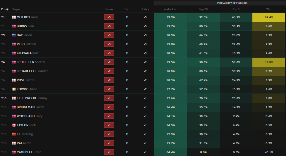These are the players I recommend monitoring closely—not just for Round 2, but as strong names to watch heading into the weekend. Four of them were already in my pre-tournament Top 10, led by my top-ranked player, Rory McIlroy. No outrights added yet, but check back tomorrow as the list narrows and the final 36 holes come into clearer focus.