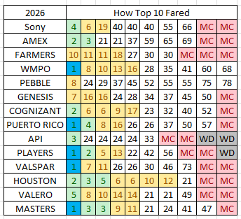 5/7 (71%) played in the Masters Tournament the week prior (4/5 made the cut)