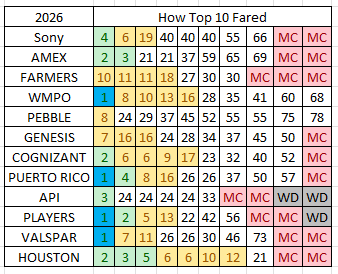 3/6 (50%) with at least 2 Top 20 finishes in past appearances