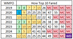4/6 (67%) with at least 2 Top 20 finishes in their last 4 starts