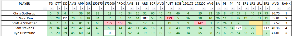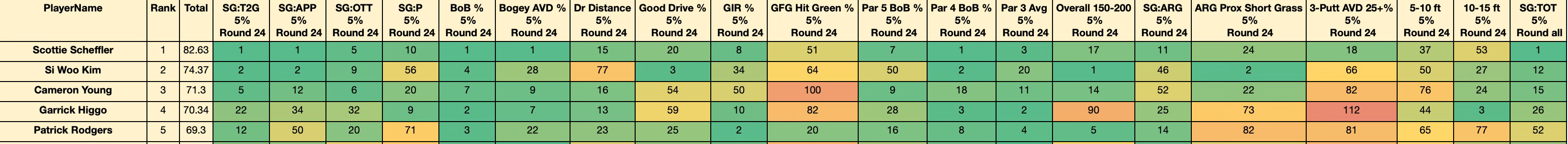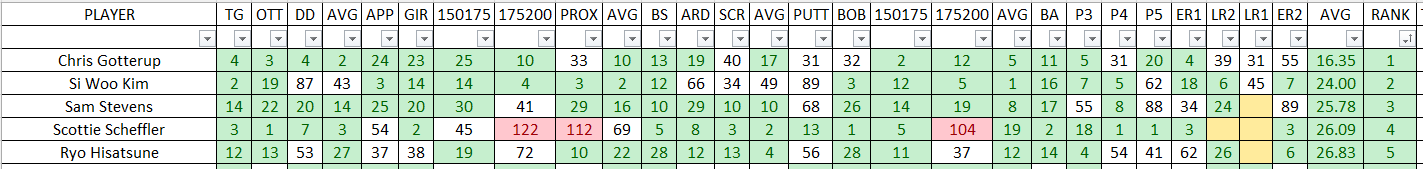 2022 winner Scottie Scheffler was 3rd in P, 4th OTT, 12th ARG, 13th T2G, 85th APP