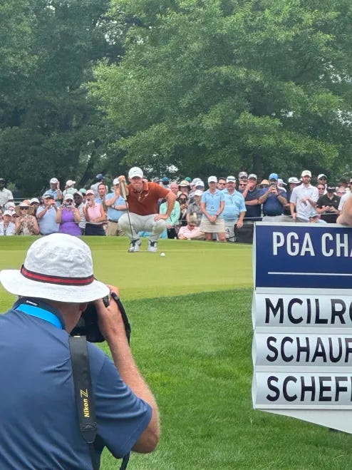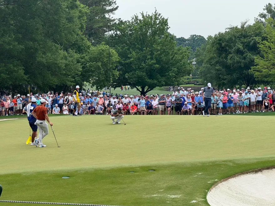 Quail Hollow continues to prove why it's one of the PGA Tour’s most regarded venues. Despite its sprawling grounds and massive layout, there is a subtle intimacy to the course – specifically greenside on the front 9. The amphitheater vibe of the greens generates an energy and excitement from golf fans, as the world’s best golfers try to navigate the quick, undulating greens. I have to say, it wasn’t as difficult to find good spots at most of the holes as I expected, which definitely added to the experience. It’s such a beautiful property, Quail Hollow. The view at the Par 5 7th is quite unreal, as the fairway and massive green neighbors a row of stunning mansions – separated by a pond that cost Xander Schauffele a chance at birdie on Friday and ended up ruining our 2nd round Under 70.5 bet on him. Meanwhile, almost the entire back 9 wraps around a picturesque body of water that certainly comes into play on the Par 4 16th – the first hole of the “Green Mile.” One of the shots of the day that I saw was just before the Green Mile at the Par 5 15th, where Tony Finau connected on a 42-foot eagle putt just after Scottie, Rory and Xander passed through.