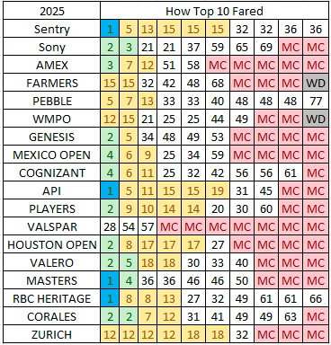 Top Comp Finishes: 6,11,12,16,34,36Insights: The results that WZ has this year don’t do him justice for his approach game. OTT has been a rollercoaster but mostly gains while the Around and Putter been dreadful. Still looking for his first Top 10 of 2025, Craig Ranch will help to avoid big numbers and if he is missing greens then he won’t contend anyway on a birdie fest week. Bad news is the flat stick somehow only 142nd for the season but 3 straight of losing at least .5 to the field including 1.6 at augusta is tough. Predict when the flat stick will work then he will be contending. Otherside, his last Top 5 finish….March 2024 so how he does under the gun will have to be seen as well. Dallas guy who plenty cheering for him and grew up with Scottie so intimidation won’t be there but no reason to believe flat stick will be there either (-1.11, -2.14 in two trips at TPC CR).