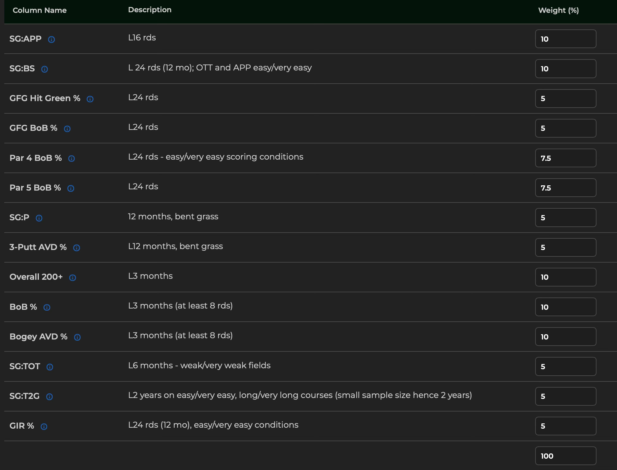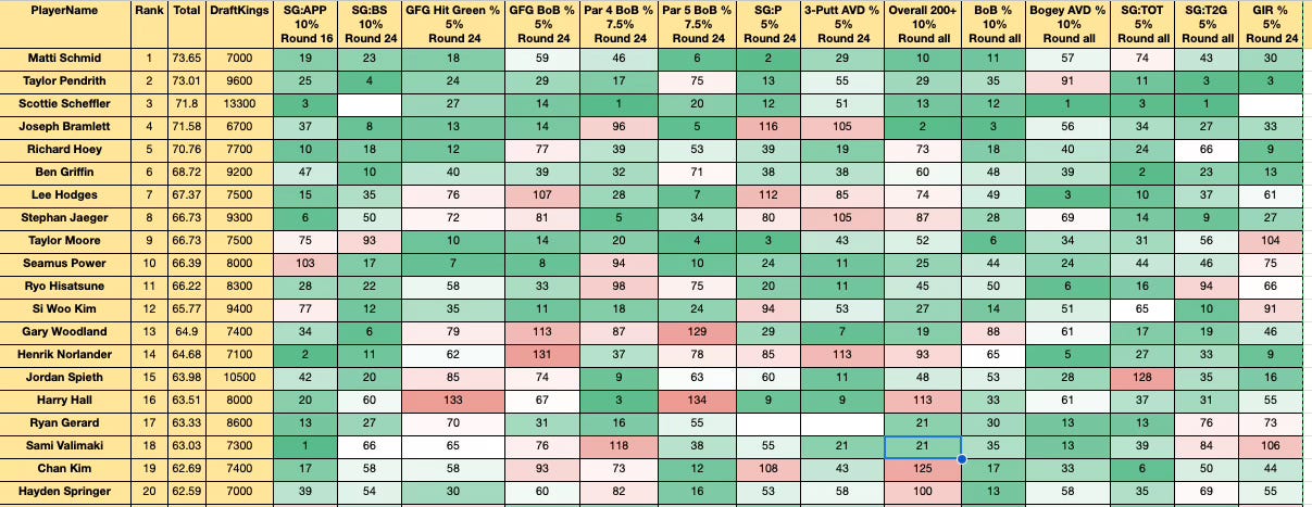 Insights: Becoming a current season regular to my Top 10 and just racking up the stats this season is Ryan Gerard with only 1 MC in 12 starts and 6 Top 25 and 2 Top 10s. Approach is definitely leaking oil and putter cooled off for the last 2 weeks as well. Did putt beautifully at the Valero and Approach gain nearly gained 2 strokes at Memorial Park (both Texas tracks). There is a path if he can replicate what he did at Memorial Park (65-65-68-68) but that will only get him to -14 and also require an uptick in his Approach game.Will Zalatoris (WITHDRAWN - REPLACEMENT COMING LATER)